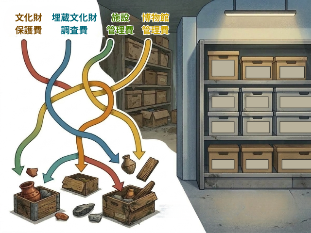 発掘調査によって資料は増え続けるが、収蔵施設の整備には多くの時間と予算が必要になる。保管費が予算上で分散し、独立した費目として見えにくい構造は、予算申請の根拠を作りにくくし、保管体制の整備を後回しにさせる要因にもなっている。